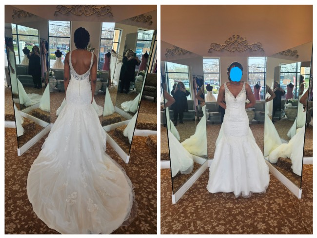 The gown was only worn to try on, I purchased it but decided to wear a different gown on wedding day. The gown has no alterations.