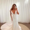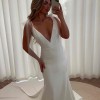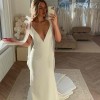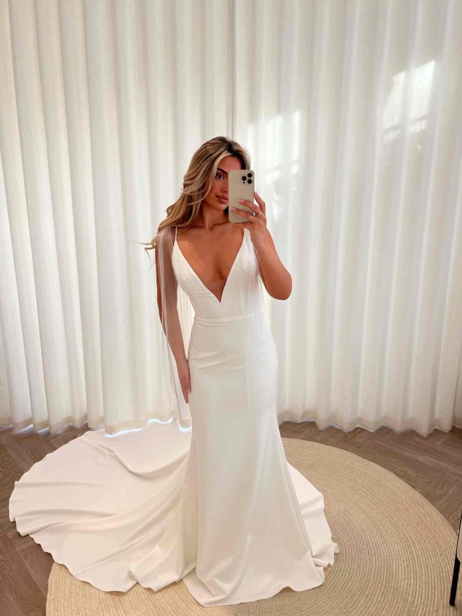 Hendrix bridal gown features one of our signature Made With Love designs low back combined with our popular, buttery double layer French crepe. Her daring low back, flattering illusion tulle side cut-outs, plunging V neckline and statement long train make Hendrix the perfect design for the bold, yet classic and elegant bride. Detachable Elsie Tulle bows are included for a fun, feminine flair on this otherwise timeless gown.