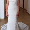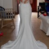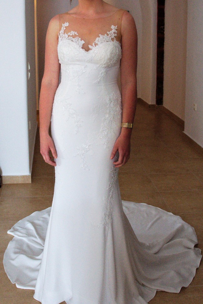 Pronovias Plisa fitted size UK 10. White crepe with lace, crystal and bead detailing. Mermaid style flare from knees. Sheer top with lace and beading detail over neckline and up back. Discreet hook at buttock to clip train up for partying post ceremony. Dry cleaned post wedding and kept in it’s box ever since, this dress deserves another dance at someone else’s magical day. Includes the bag to hang and transport dress for the big day.