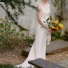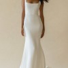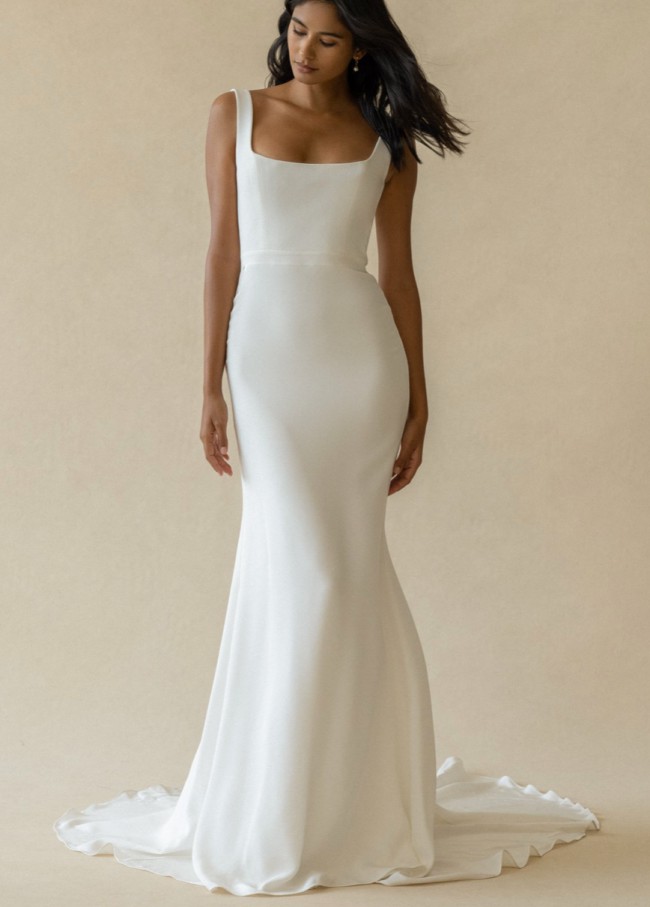 Alexandra Grecco “Colette” 100% matte silk crepe off white gown with tank straps, soft square neckline, structured bodice, and classic fitted skirt with short train.