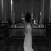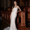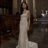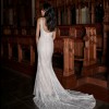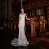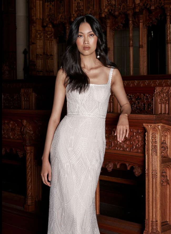 "Poet in all her geometric glory is a slimline silhouette with slight fit and flare. Featuring a square neckline with wide shoulder straps, edged with a diamond embroidery trim. Her embroidered sheet lace of geometric influence is a little art deco in design, modern and beautiful. Lined in our signature stretch charmeuse lining, to give a luxurious soft feeling against the skin. As she walks away her 27″ illusion train floats beyond her leaving all who see her wanting more."