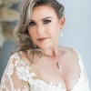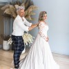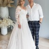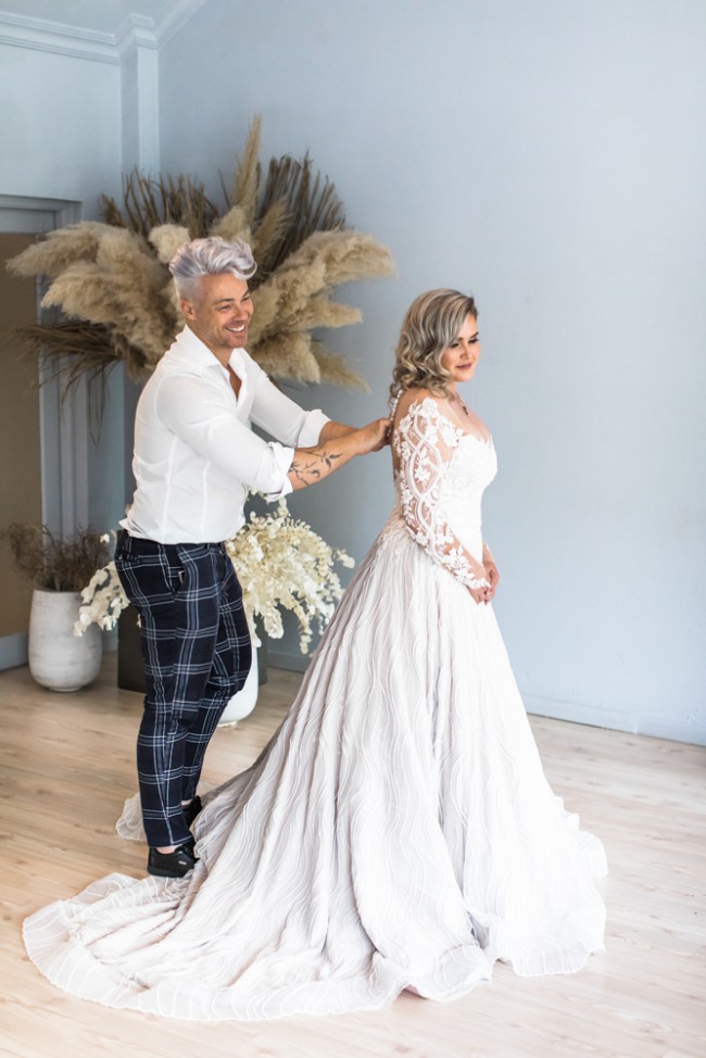 The bodice is structured with a full corset, offering support and shape, and is finished with a row of dainty buttons for a classic touch. The long, full sleeves, also covered in lace, lend a regal feel, perfect for formal or evening wear. Beneath the skirt lies a built-in petticoat that adds volume and ensures the skirt flows beautifully. Designed and meticulously beaded in India, this gown is a harmonious blend of tradition and contemporary design, exuding sophistication from every angle.