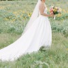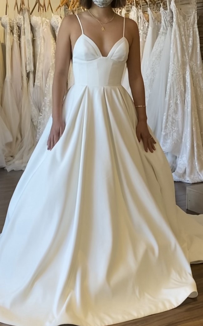 The ivory fabric cascades into a stunning floor-length skirt that made me feel like a princess on my big day. One of the best features? It has pockets! I loved having a discreet spot for my lip gloss and vows, combining practicality with sheer beauty. The low back adds a romantic touch, making it perfect for twirling on the dance floor.