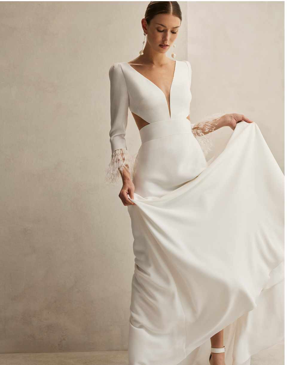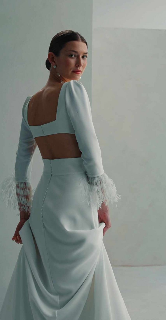 This Flandes dress by Aire Atelier was my dream gown for my wedding day, and I’m excited to pass it on to another bride who will cherish it. Crafted from luxurious crepe, the fabric hugs the body beautifully while ensuring a streamlined silhouette. The sheath design enhances your figure while providing a sense of elegance and sophistication.