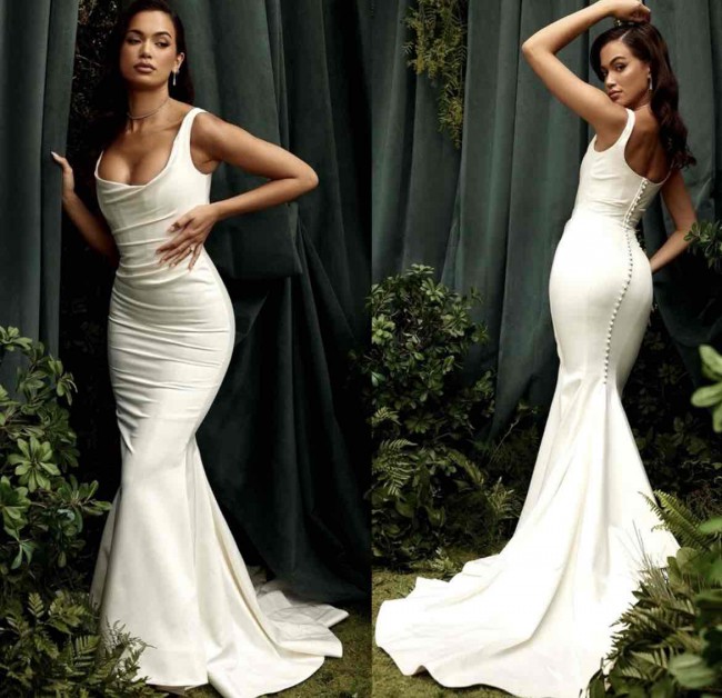 Delicately cut from our lustrous and ultra luxe heavyweight duchess satin, our 'Emilie' gown looks so chic and elegant from every angle so you're guaranteed to feel confident and beautiful on your big day. The romantic gathering to the bodice is framed with elegant shoulder straps and features our classic corsetry boning to cinch the waist right in and lift the bust for the most flattering silhouette. The skirt is fitted over the hips and falls to a graceful, mermaid shape from the knee. It has a classic godet train to the back that sweeps the floor beautifully. The delicate satin covered buttons run down through the back for the finest feminine touch. 'Emilie' is fully lined for a smooth and seamless finish. This is a brand new dress. No alterations & never worn. Needs to be steamed