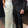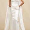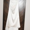 Strapless corset with peek-a-boo bustier and flattering draped modified trumpet gown with soft scarf streamer. 100% silk.