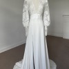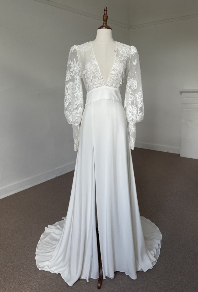 Caroline Takvorian's 2024 collection, the MUSE gown is a stunning, breathtaking look made of classic Calais lace and organza silk skirt with a plunging V-neckline, leg slit and a large flattering waistband to create a romantic dress.