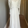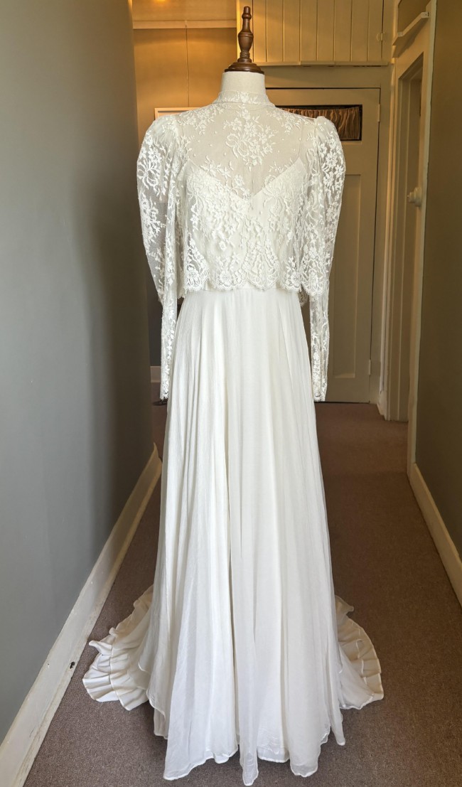 Caroline Takvorian's iconic Lenny & Joey two-piece wedding dress. With elbow-length sleeves that are incredibly flattering and offer a lovely amount of coverage without the weight of a full sleeve, the duality of the dress is ale to take off the lace blouse later in the night for a beautiful party look with an incredibly sexy back.
