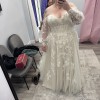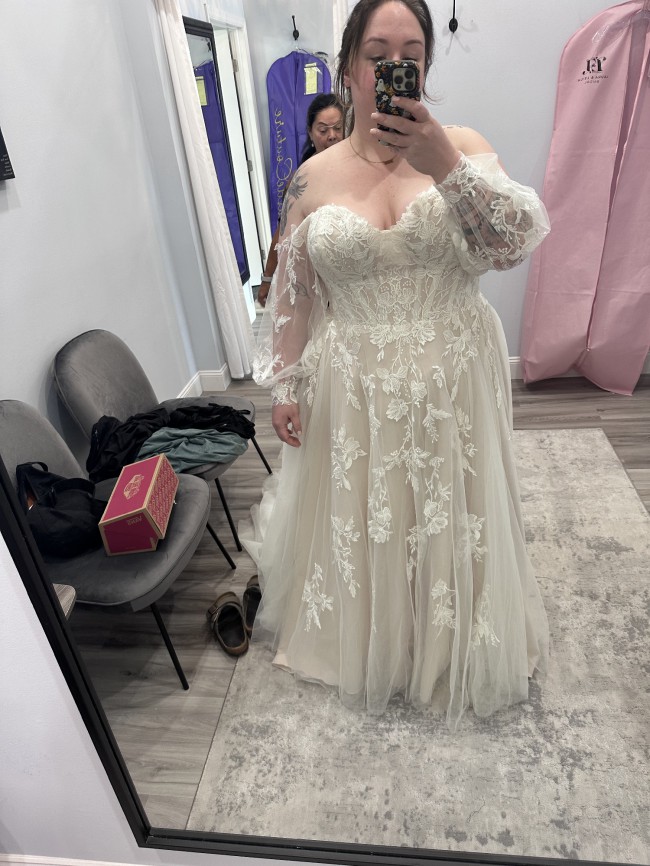 only worn for fittings. bustle and breast cups/boning added. sleeves are custom and can come on and off with a button.