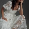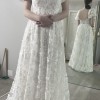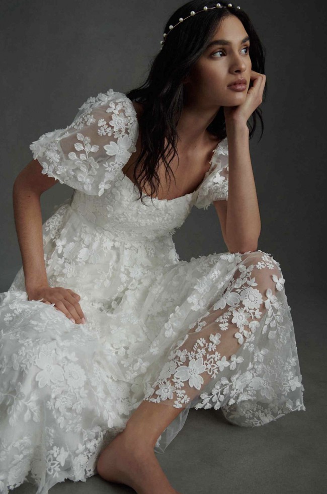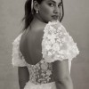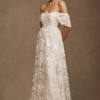 This is a Willowby by Walters gown - Lilia. Delicate allover florals add alluring dimension to this romantic A-line gown. The dress features a sheer back that shows off the intricate embroidery. The puff sleeves can be work on or off the shoulders.