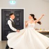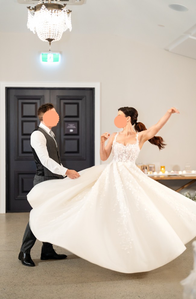The elegant structure of the gown really made me feel like royalty on the day. It has a square neckline and exposed boning detail which is adorned with 3D beaded lace embellishments giving a striking contrast to her structured full princess skirt.