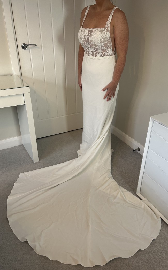Jack features a bold square neckline and deep V back pattern that flatters every shape. Her flirty and feminine floral lace bodice pairs beautifully with her stand-out, figure hugging crepe skirt and illusion V side cut outs. Jack also features a stunning illusion 3D lace belt to perfectly blend her intricate bodice together with her luxurious double layered French Crepe skirt.
