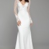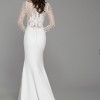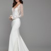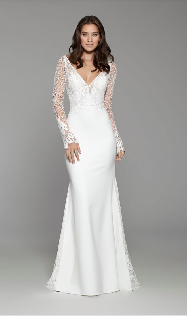 Tara Keely by Lazaro bridal gown with diamond white crepe long sleeve sheath gown, lattice Chantilly lace bodice with floral detail, V neckline with delicate trim accent, sheer high back, lace godets, accenting the skirt and chapel train.
