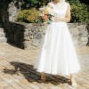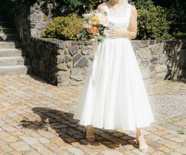 Custom made ankle lenght wedding dress from designer called Petitee. It is 100% cotton. Fabric from Italy. Petitee is a small wedding dress desinger from Prague. My size is S-M and I am 176 cm tall.