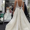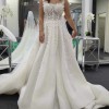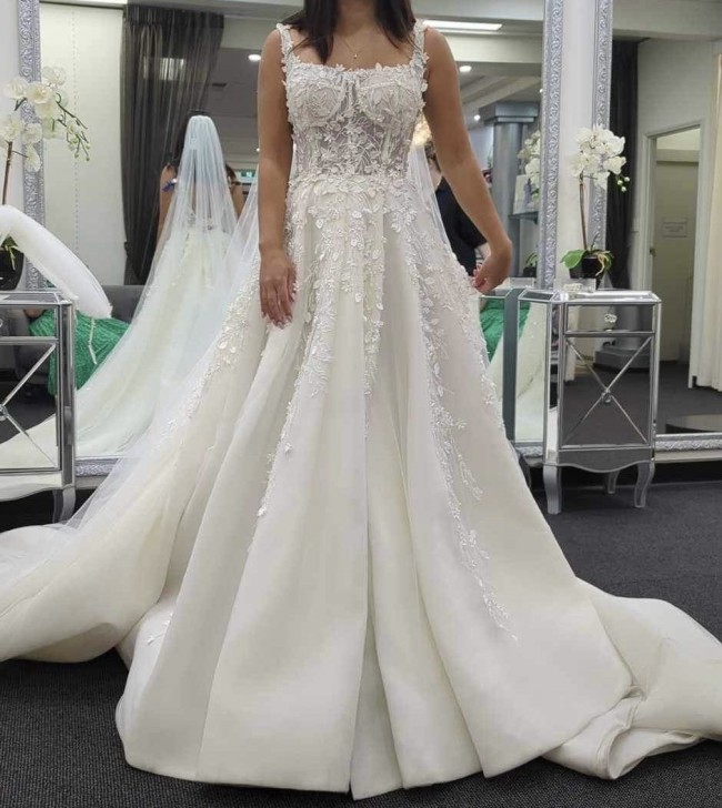 Her show stopping full pleated skirt with high slit is the defining feature of this gown as it glides down from the low backline. Her modern square neckline and exposed boning detail is adorned with 3D beaded lace embellishments giving a striking contrast to her structured full princess skirt. She truly is the modern fashion royalty of our Atlas Collection.