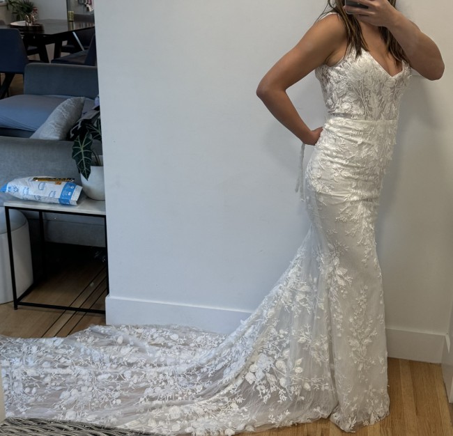 Remi will hug your curves in all the right places and have all eyes on you with her breath-taking 3D floral lace and intricate Chantilly lace underlay! She features a subtle, flattering V neckline and delicate petals along her elegant straps and belt for the perfect extra pop of romance. Remi’s effortlessly beautiful silhouette, iconic MWL low back and statement long train will have you looking and feeling flawless on your wedding day…
