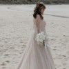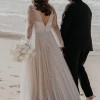 The dress is long sleeved has a small train and a plunging V neckline.