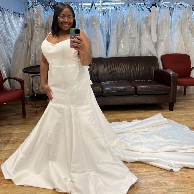 With head-to-toe matte mikado fabric, this gown uses clean lines and bold accents to deliver a fresh take on a classic silhouette. The scooped neckline is effortlessly stylish and supportive, with boning along the bodice. The simple double strap adds a delicate touch, meeting at the back of the gown in a delicate V shape. All down the skirt, contour seaming beautifully highlights the body’s natural curves, flaring out below the waist to complete the timeless fit-and-flare silhouette.