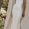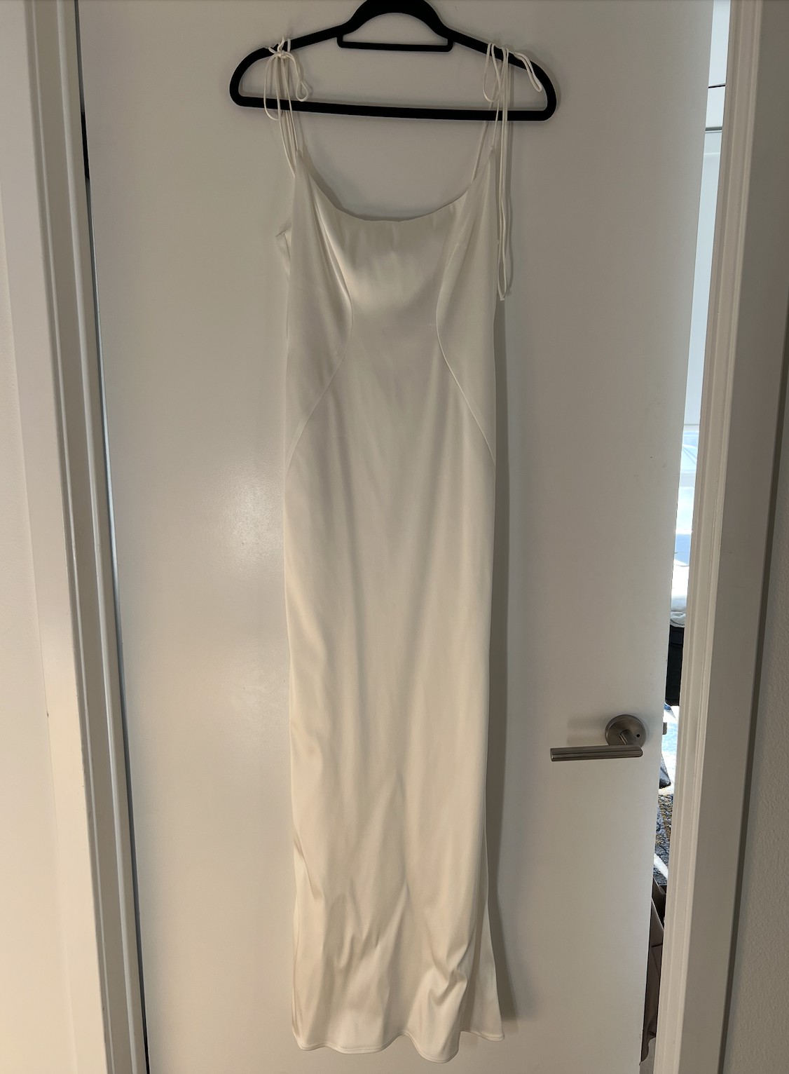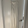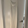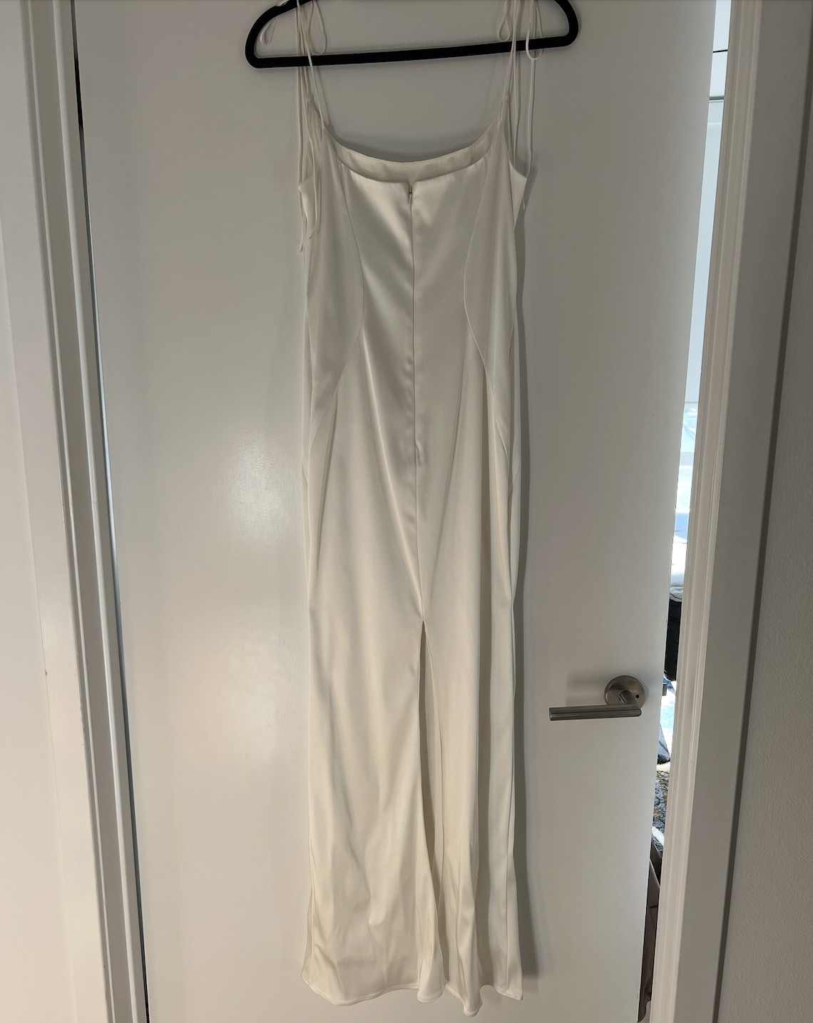Perfect dress for a bride looking for a simple but unique style. The versatile tie straps add an elegant touch to this gown. You can tie them on top of the shoulders or in the back of the dress. The skirt has been altered, no more train/fabric on the bottom - created a column like skirt with slit in the back of the dress. The slit is two feet off the floor - can be altered if needed. Very small fabric snag on back (pictured).