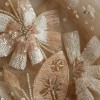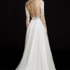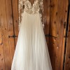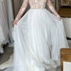 Rosewater long sleeve A-line dress with illusion floral beaded bodice, bateau neckline, Low open back, layered English net circular skirt.