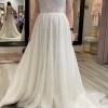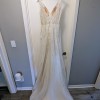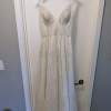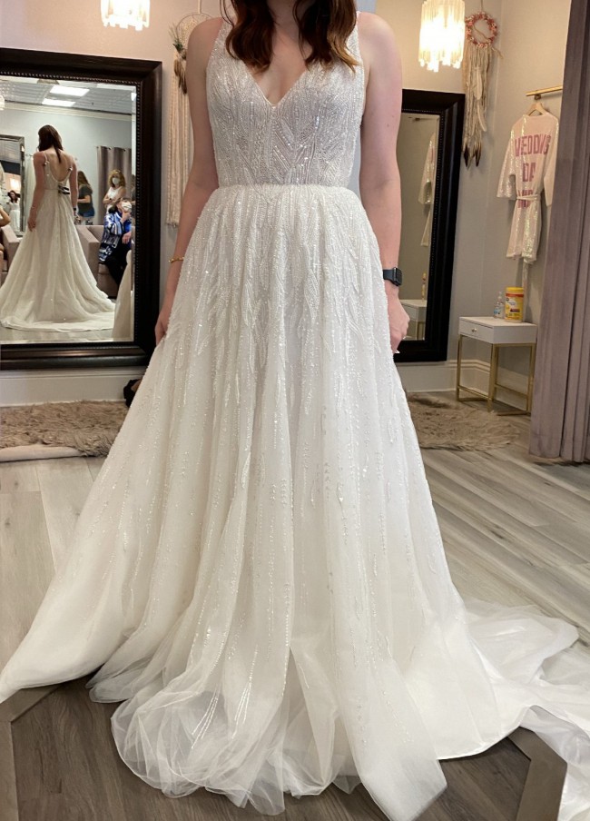 This dress was custom made and never worn, in pristine condition, with tags still on. The Beau is a V-neck, A-line gown with a natural waist and bodice that is fully beaded, highlighting the neckline and tapered straps. The design floating over the skirt and train for a subtle sparkle. Each bead, sequin, and pearl is hand-sewn into lines, stylized leaves, and delicate squiggles to dazzling effect. The dress has been stored appropriately in a smoking free home. Details on dress can be found here: https://enaura.com/products/es764-beau