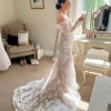Modern and romantic, lace fit and flare gown. With a Nude under layer.