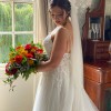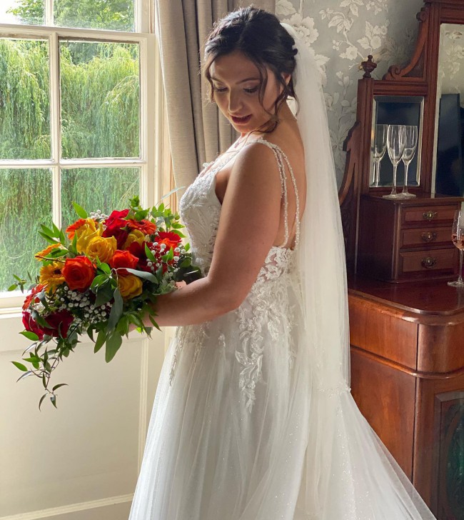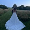 This dress is sure to wow and make any bride feel like a dazzling goddess. The diamanté straps compliment the backless style, giving it a unique edge. The glitter underlay of the skirt sparkles like diamonds in the sun. The silhouette is flattering, drawing in at the waist before cascading over the hips into a train with embroidered edging. The dress is brought together by the laced embellished bodice with illusion panelling. The mesh is slightly stained from my spray tan and appears nude (the dress has been dry cleaned). This does not affect the design and impact/look of the dress, but instead blends against the skin better. Photos listed by the designer can be found at https://www.morilee.com/wedding-dresses/morilee/dina-wedding-dress/