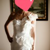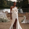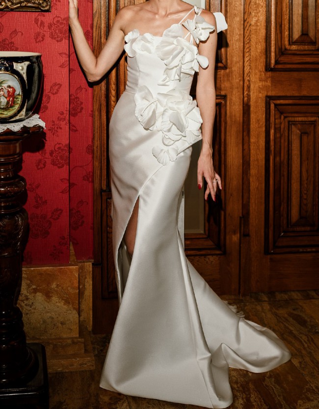Elegant, luxurious and non-ordinary wedding dress for Milla Nova in ivory color, with subtle shine. The dress is made out of mikado and it has its structure but it is also following the body line. Very comfortable and light for summer outdoor weddings.