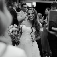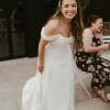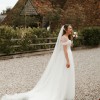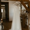 Flower detail with small subtle sparkle detail, boning in bodice with zip back and net detail with embroided flowers at the top of the back. Detatchable off the shoulder sleeves.