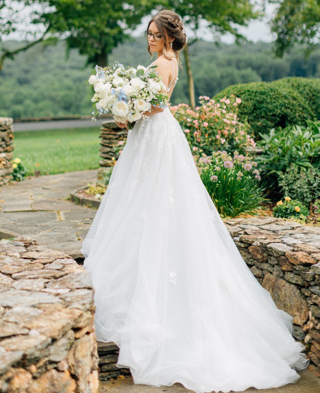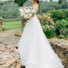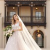 An organic-inspired masterpiece, this gown is showered in rich three-dimensional florals and linear beadwork for brides who are all about the details. Glitter tulle and beading throughout the skirt create an overall shimmery silhouette, while remaining fresh and easy to wear. The curved V-neckline is finished with organic edging, following into thin beaded straps that split into a double strap feature at the top of the shoulders. Now's your moment to wow the crowd, as the double strap splits into a criss-cross detail with a central floral clasp. Floral lace appliques extend gently over the waistline and disperse throughout the skirt for a natural effect, keeping the base of the gown lightweight and fresh.