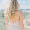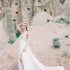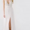 A lightweight chiffon dress with beaded lace, a modern tie, and a slit skirt.
