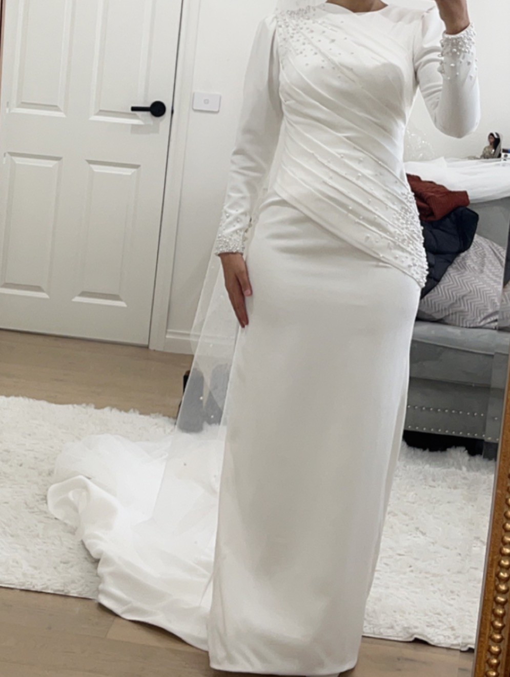 Details: has pearls and some beadings at the chest area. Comes with veil and pearls on.