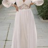 This dress is beautiful. It’s a floaty and light dress with lace detailing on the cuffs and a lace/mesh piece in the waist. I had the dress fully lined so it is not see through and had the waist part filled so you cannot see through to the skin. A seamstress added a lace modesty piece, but that can easily be removed.