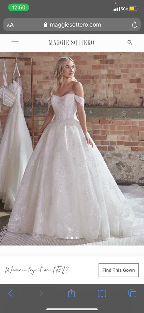 The Maggie Sottero ball gown wedding dress is a stunning and timeless design, featuring a voluminous skirt that creates a dramatic and romantic silhouette. Made from luxurious fabrics like satin, tulle, or organza, it includes intricate lace, beading, and embroidery for added sophistication. The gown's fitted bodice enhances the bride's figure, while the full, sweeping train adds an elegant touch. A bustle has been added for convenience, allowing the train to be easily lifted and styled during the reception, ensuring comfort and continued beauty throughout the celebration. Please reach out, and I can provide more details!