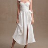 ‘ Sweet yet daring, the V. Chapman Vera Bustier Midi Dress offers a front slit, a full skirt, a boned bodice and adjustable spaghetti straps. Perfect for a reception ensemble or a memorable celebration of your choosing.’