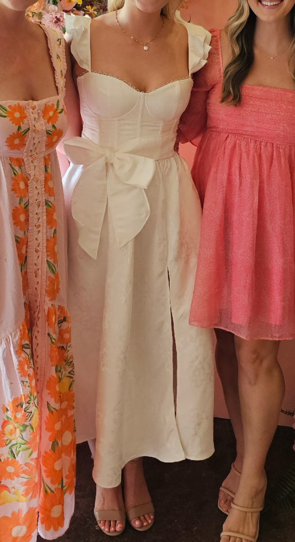 I wore this dress for my bridal shower and felt so comfortable in it! The satin fabric has beautiful intricate floral details. I received so many compliments and multiple people commented it could be worn for a bridal gown as well!