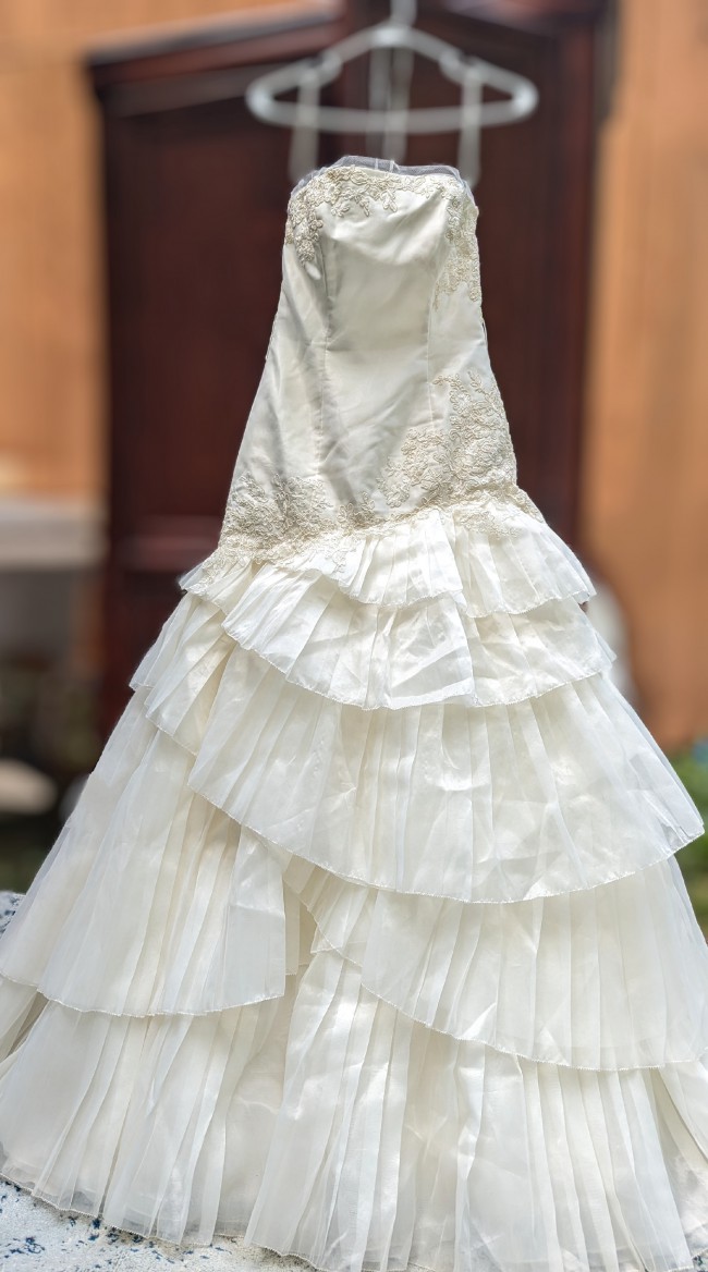 Vera Wang, White strapless, ivory, size 6 Sample Gown. Beautiful lacework, dropped waist, and tons of tulle. Belt loops if you want to add bling, or simply remove them. Get the designer dress of your dreams, for a fraction of the cost.