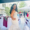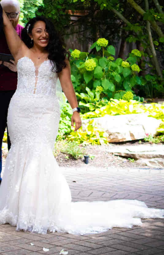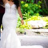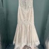 The dress when pictured appears white. Looks slightly pink on the rack but photographs white. It is very comfortable and flexible for a mermaid dress. It has been preserved and unopened. Is in great condition.