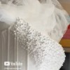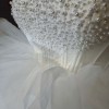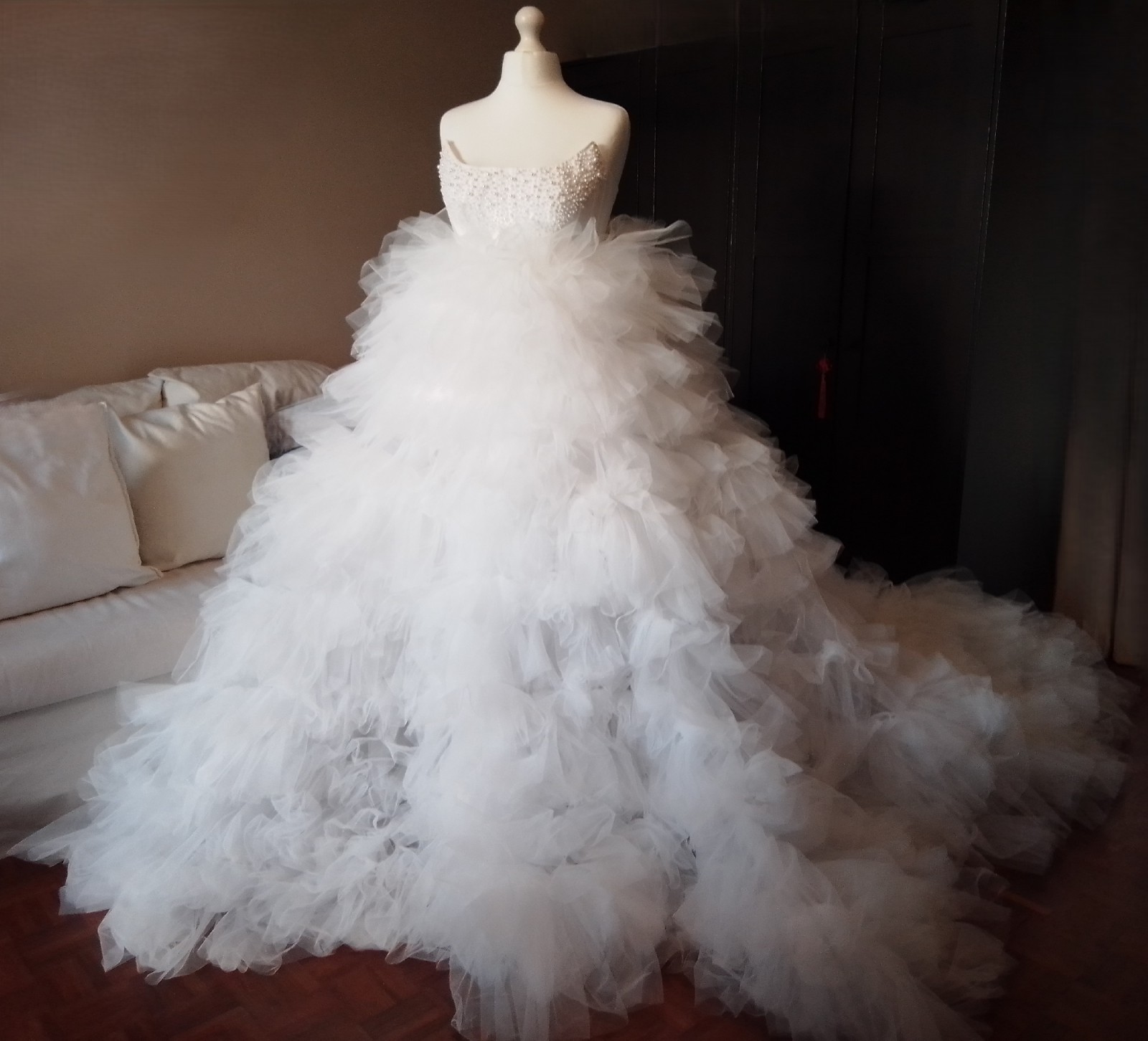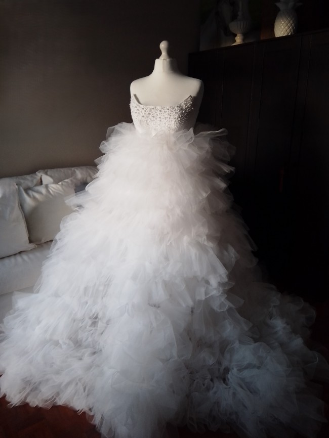 Gorgeous white wedding corset dress from tulle. The gown is off-the-shoulder, the bodice adorned handmade with numerous small white pearls, creating a textured and elegant appearance.