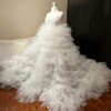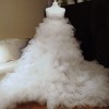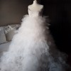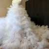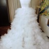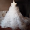 The skirt of the dress is voluminous ruffled and has a long hem with a train.