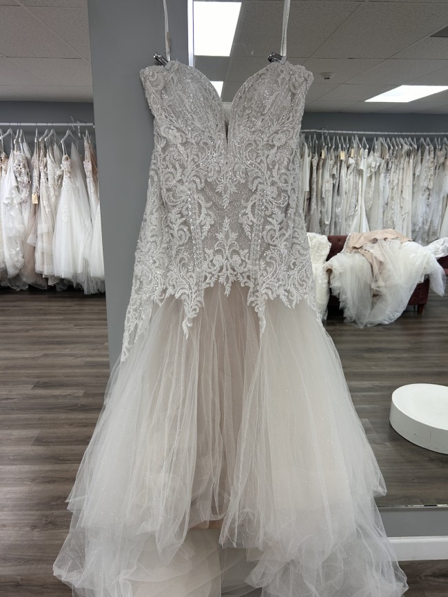 Gorgeous sparkling tulle pairs beautifully with the richly beaded and appliquéd strapless bodice