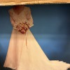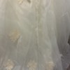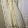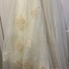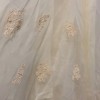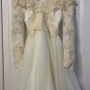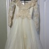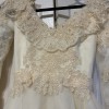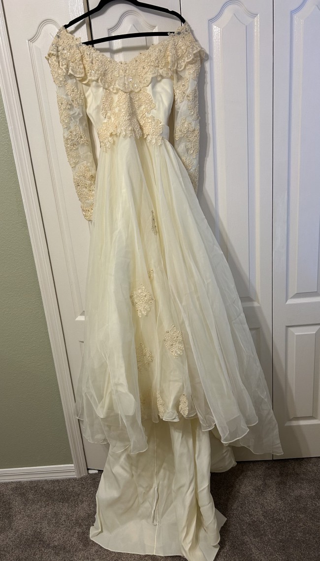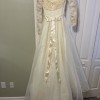 Cream/Candle color long sleeves chiffon dress with appliqués with pearls. Beautiful full bottom that can be bustled for dancing. This wedding dress is in excellent condition.