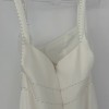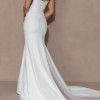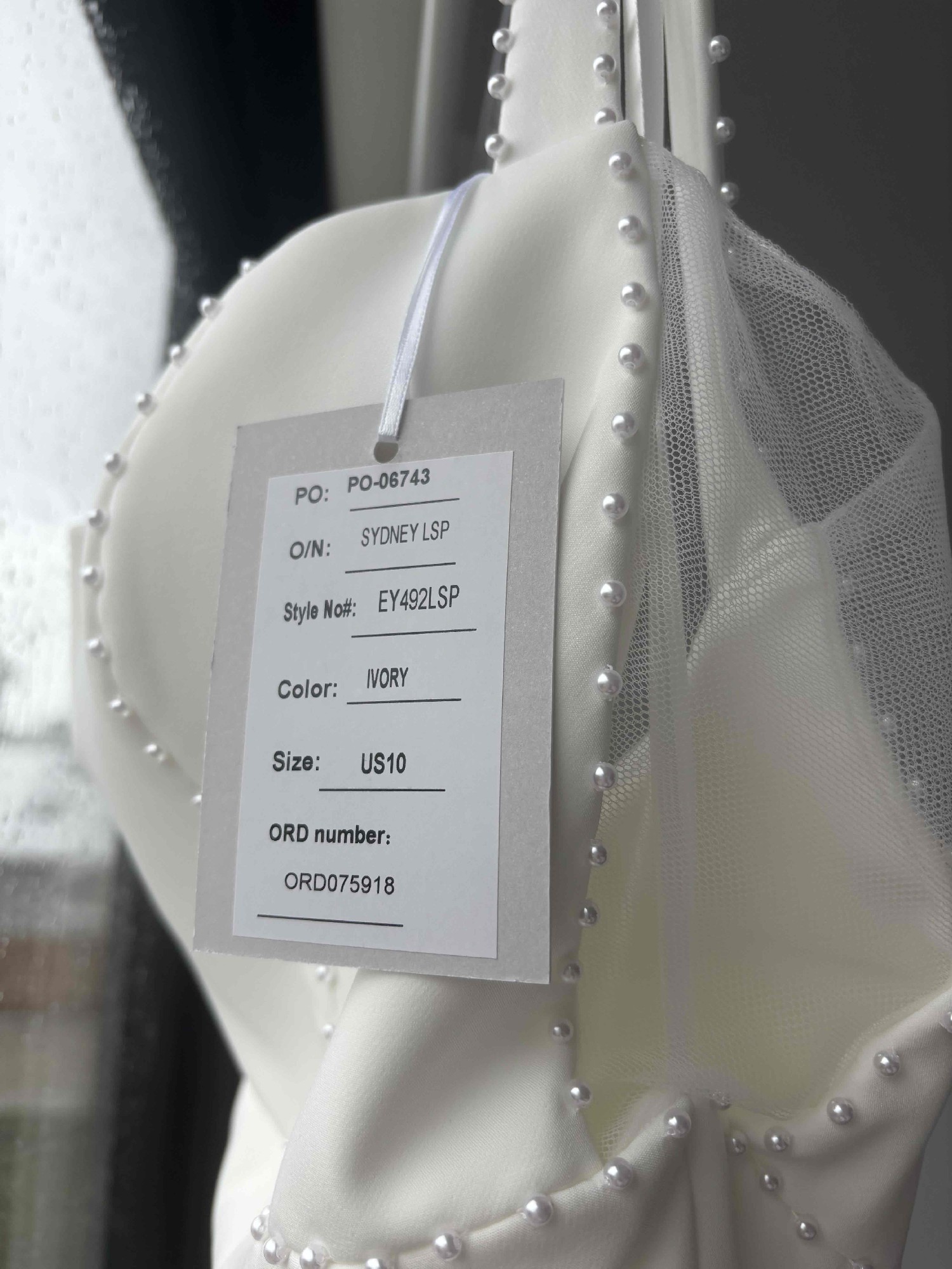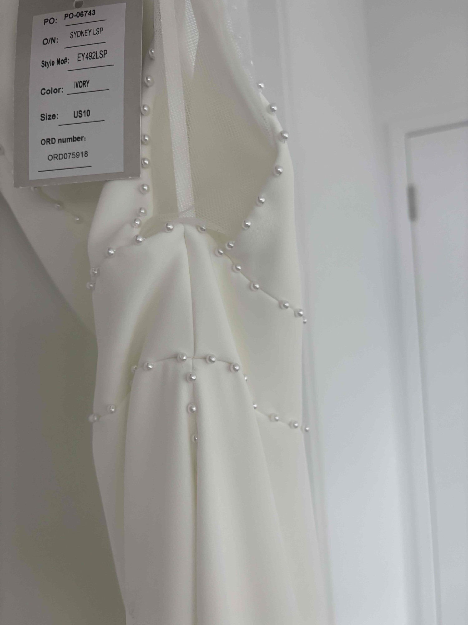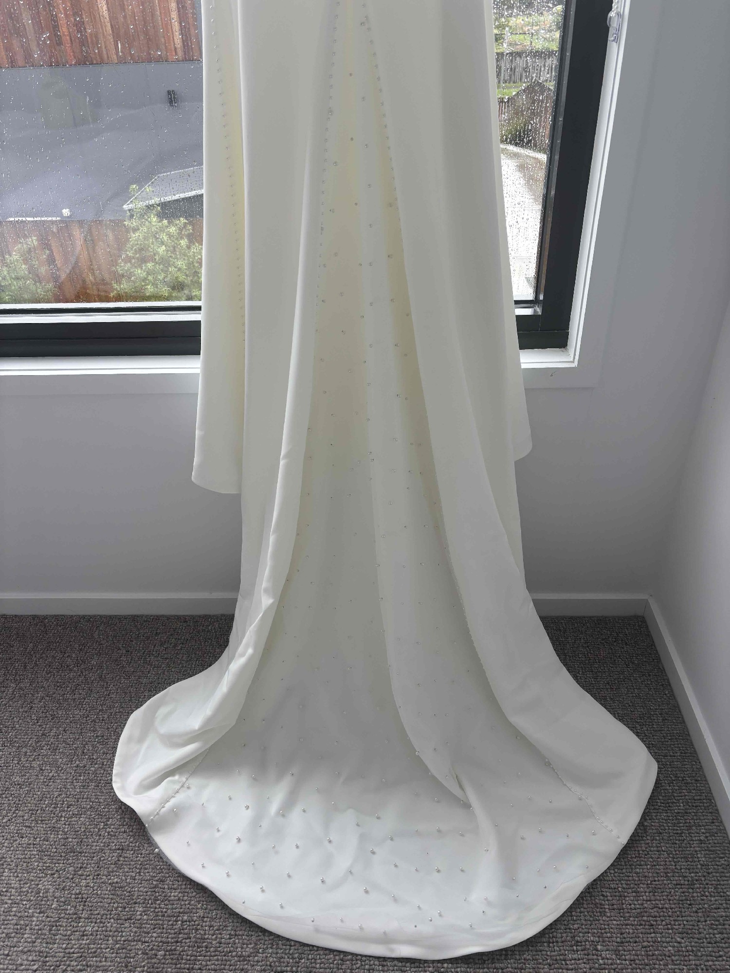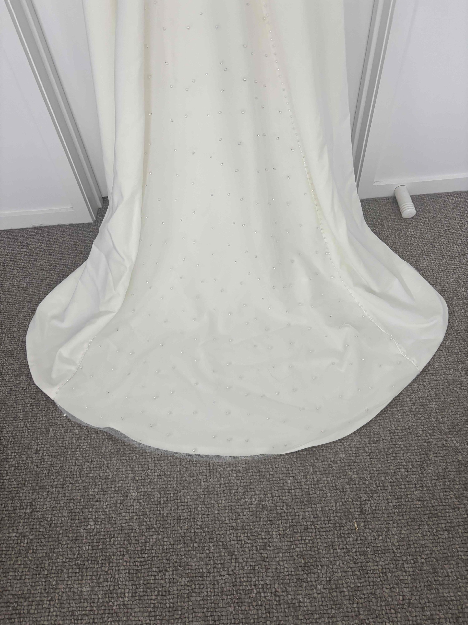 The original dress comes with a tulle feature at the back. I personalised the dress and had this feature field in with the crepe added over the top. The entire dress is now a solid crepe fabric with pearl details