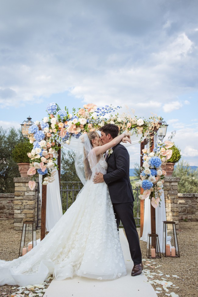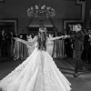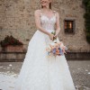 The bodice of this wedding dress combines a sweetheart neckline and subtly sexy boning for a bustier-inspired look. Hand-placed 3D floral details on the bodice and skirt add dimension and texture. Sheer details in the bodice and a bold, open back add a hint of sexiness to this classic ballgown silhouette. The stacked floral embellishments flutter with every movement, adding so much dimension to the dress. There are silk buttons that flow all the way down the midline of the back of the dress. the train is long for a bit of drama, but the bustle is flawlessly placed for when it is time to dance!