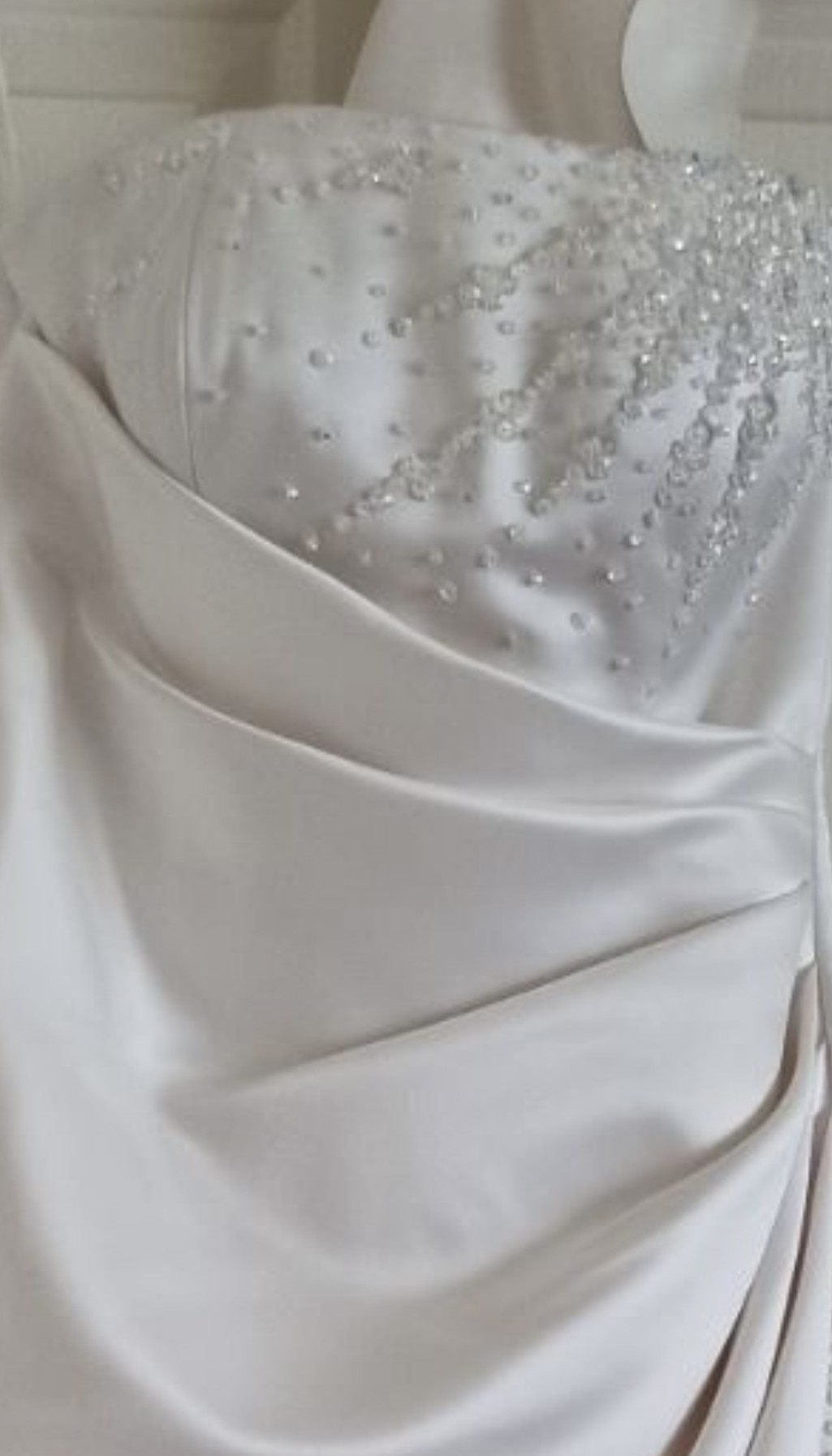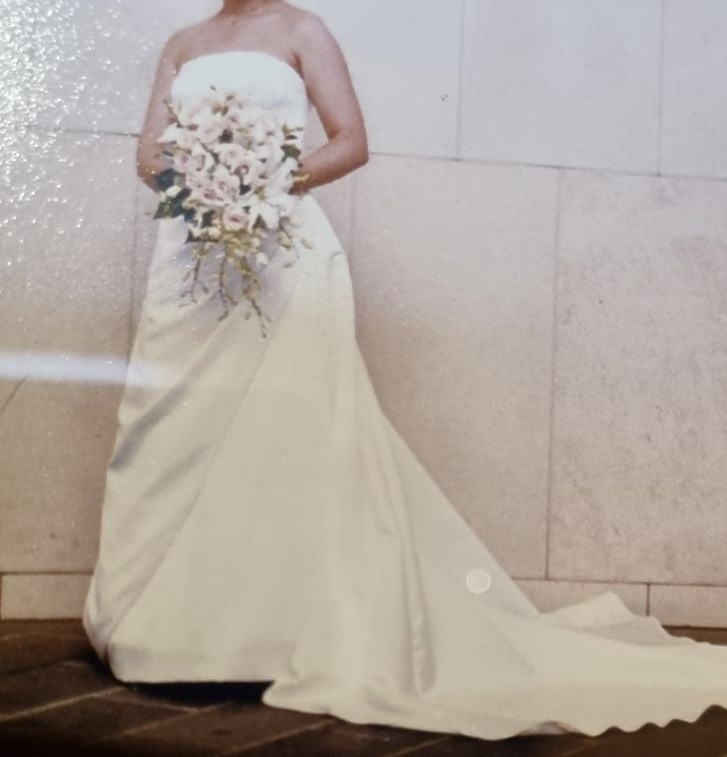 After the wedding, it was dry cleaned and placed in a professional wedding storage box. The colour is still beautiful, and all the beading and crystals are still in place. The dress has only been taken out of the box now to take a photo for this posting. The dress is currently located in Canberra at my parents house. The original petticoat is included in the price.
