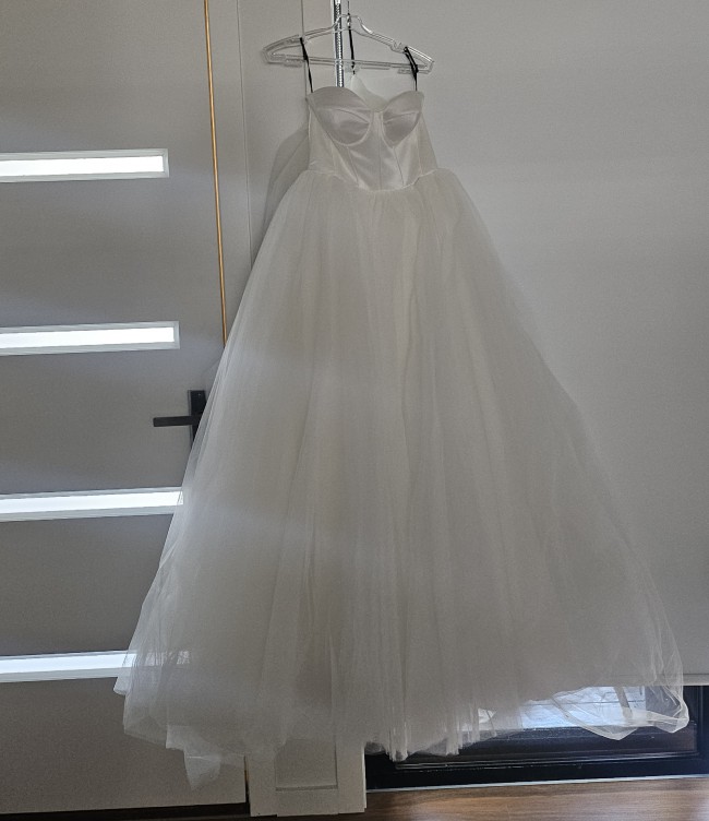 This enchanting Vera Wang wedding dress, known as the Sunday model, will make every bride feel like a princess on her special day. Crafted in a stunning size 8, this white ballgown features a sweetheart neckline that highlights the décolletage beautifully while ensuring a romantic silhouette.