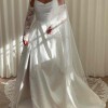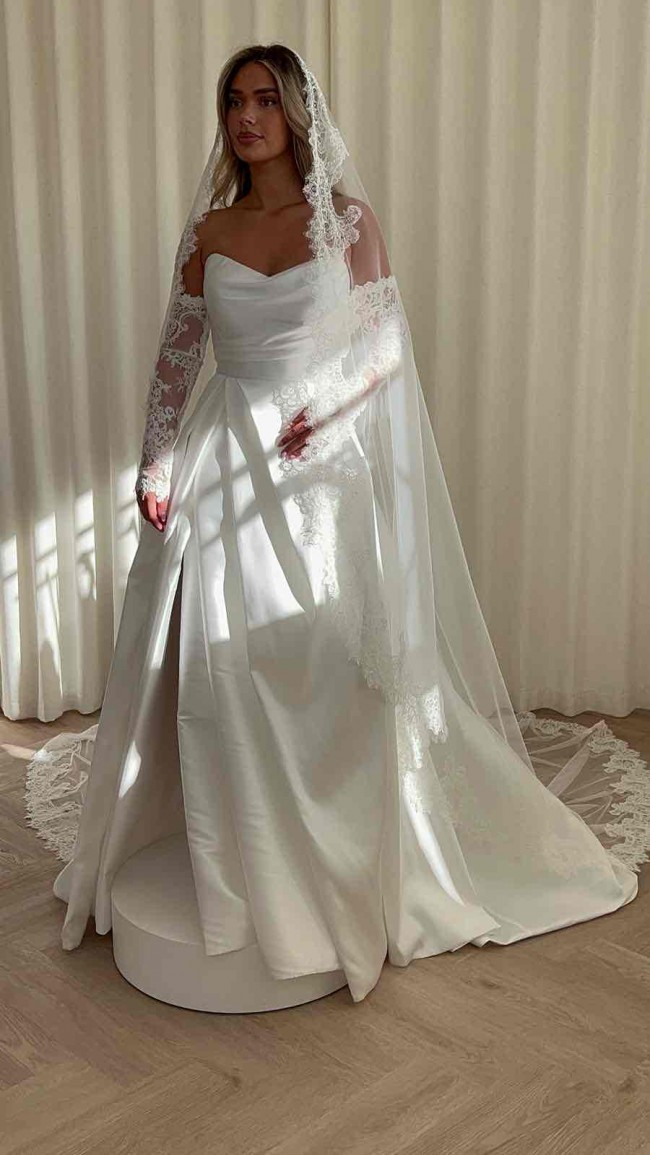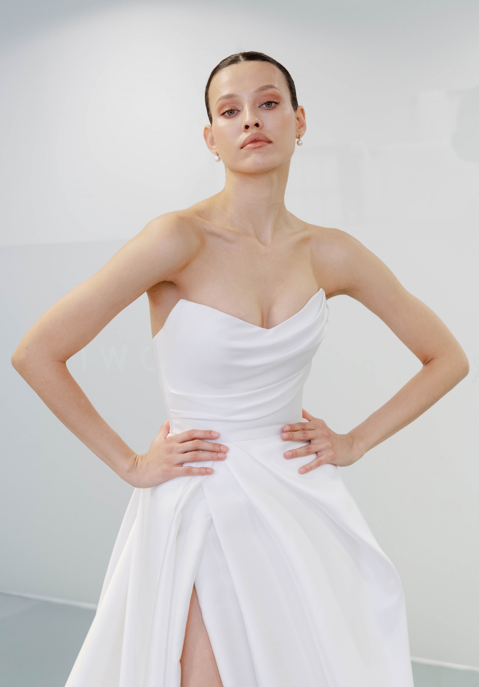 A dramatic layered pleated skirt and elegant leg split to create a sophisticated yet feminine bridal look. Dress only