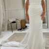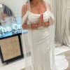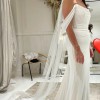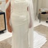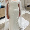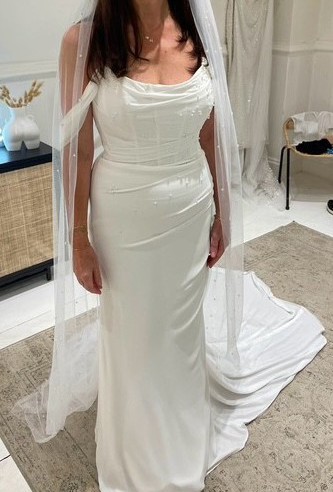Fit and flare silhouette, floor length with train. Fitted bodice with scattered pearls over draped fabric and dropped shoulders. Sale includes long pearl beaded veil.