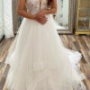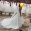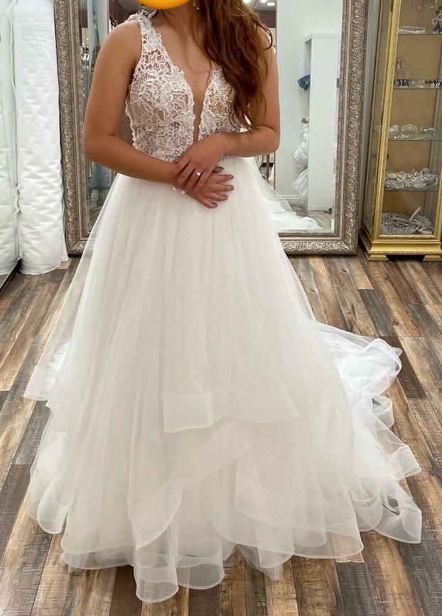 Morilee A line wedding dress. It is V neck lace on top and bottom is layered tuttle. This dress is perfect for petite girlies as I am 5’ 2” and length fit perfect with heels without have to be altered. Dress is beaded around the waste and is fitted. Comes with veil and petticoat.
