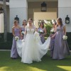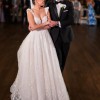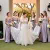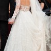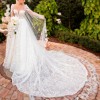 - 3D flower sleeves with bell-bottom flare at wrists, addition of multiple satin layers on the skirt for fuller effect, additional 3D flowers throughout the dress and neckline that were purchased internationally and flown in to match the dress, veil lined with flowers to match the dress